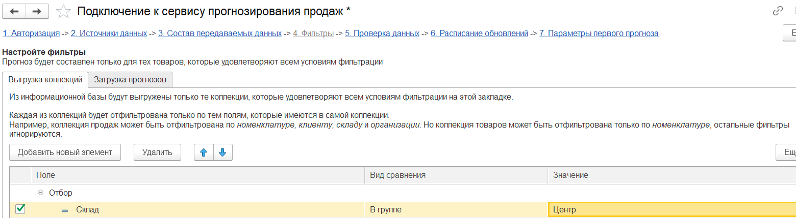 На этом этапе необходимо выбрать данные, которые нужно передавать в сервис - выбираются коллекции, обязательные и специальные поля для выгрузки в сервис прогнозирования продаж. Внутри каждой коллекции так же можно выбрать состав передаваемых полей.