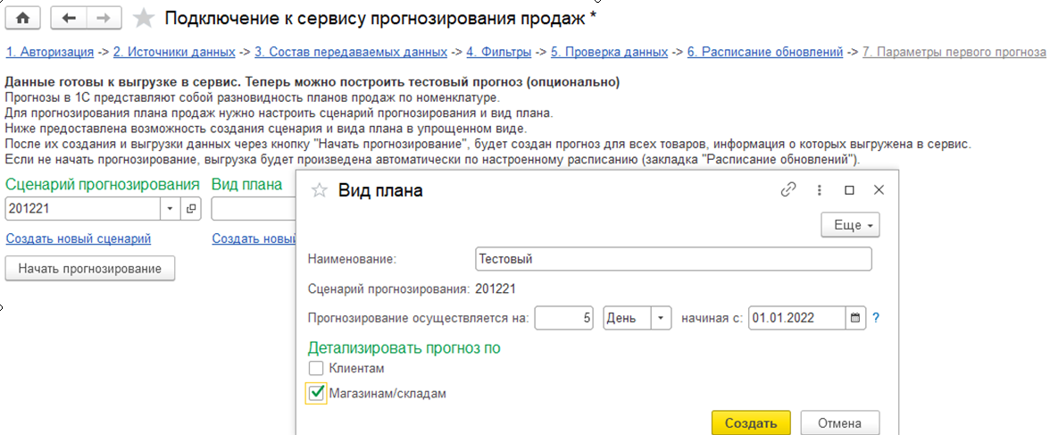 На этом этапе необходимо выбрать или создать сценарий прогнозирования и вид плана.