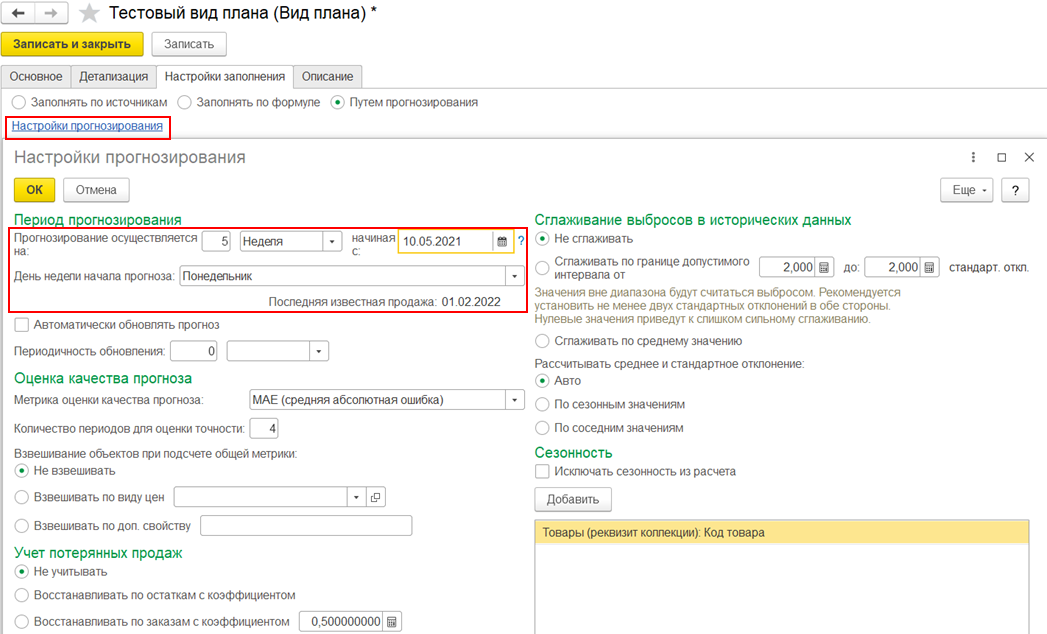 В форме настройки прогнозирования по виду плана необходимо установить: