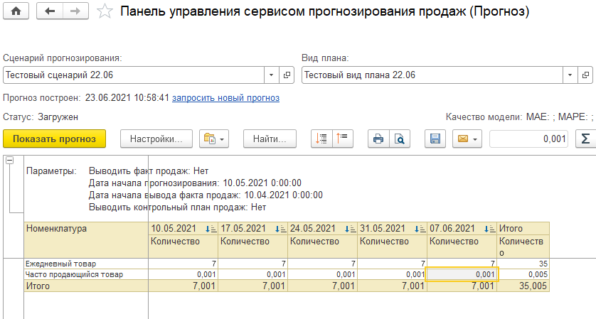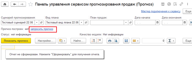 Когда сценарий прогнозирования и вид плана созданы, можно запросить прогноз (гиперссылка Запросить прогноз). Некоторое время (обычно часы) прогноз будет рассчитываться.
