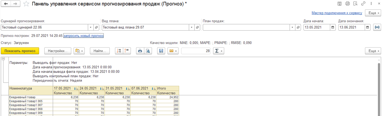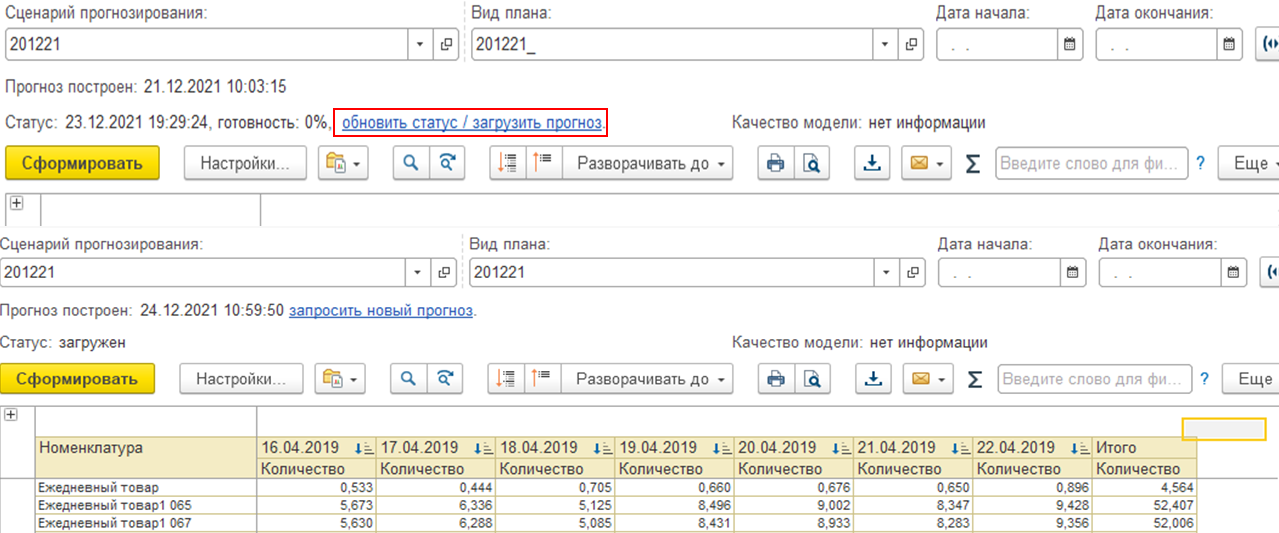 Готовность прогноза можно отслеживать по нажатию на гиперссылку Обновить статус/загрузить прогноз. При нажатии на эту гиперссылку, если прогноз уже готов, он будет загружен в программу 1С.