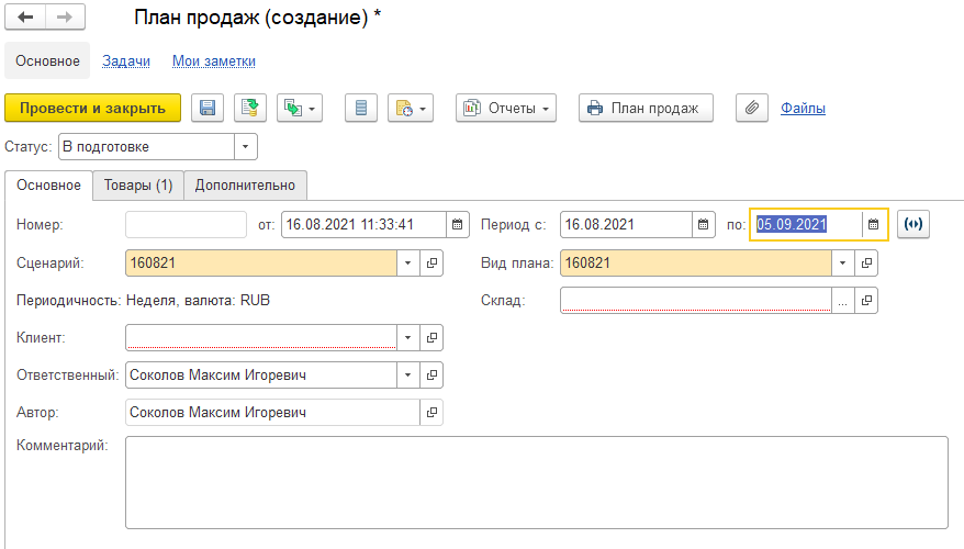 В данном примере выбрана периодичность «Неделя» и начало и конец периода соответствуют понедельнику и воскресенью. При такой настройке в табличной части товаров будет указана доступна только колонка «Количество».