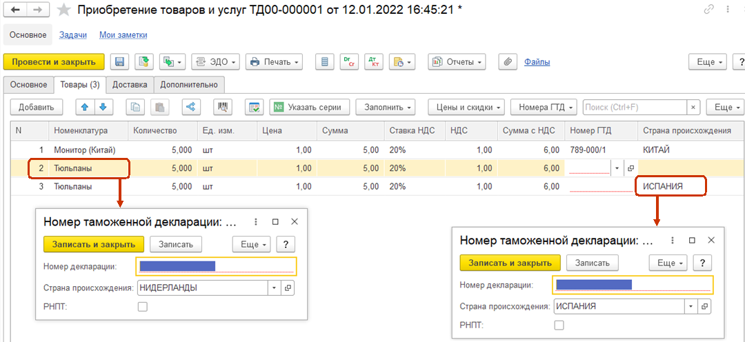При указании номера ГТД в строке табличной части документа значение колонки Страна происхождения перезаполняется данными из карточки Номера ГТД.