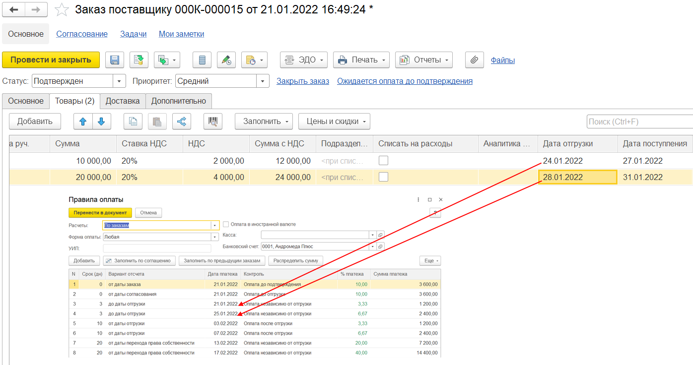 Дата поступления – это ожидаемая дата поступления товаров на склад. Если накладная является распоряжение на приемку товаров на склад, то по указанной дате будет формироваться график поступления товаров. Если дата поступления не заполнена, то накладная будет двигать график поступления датой документа.