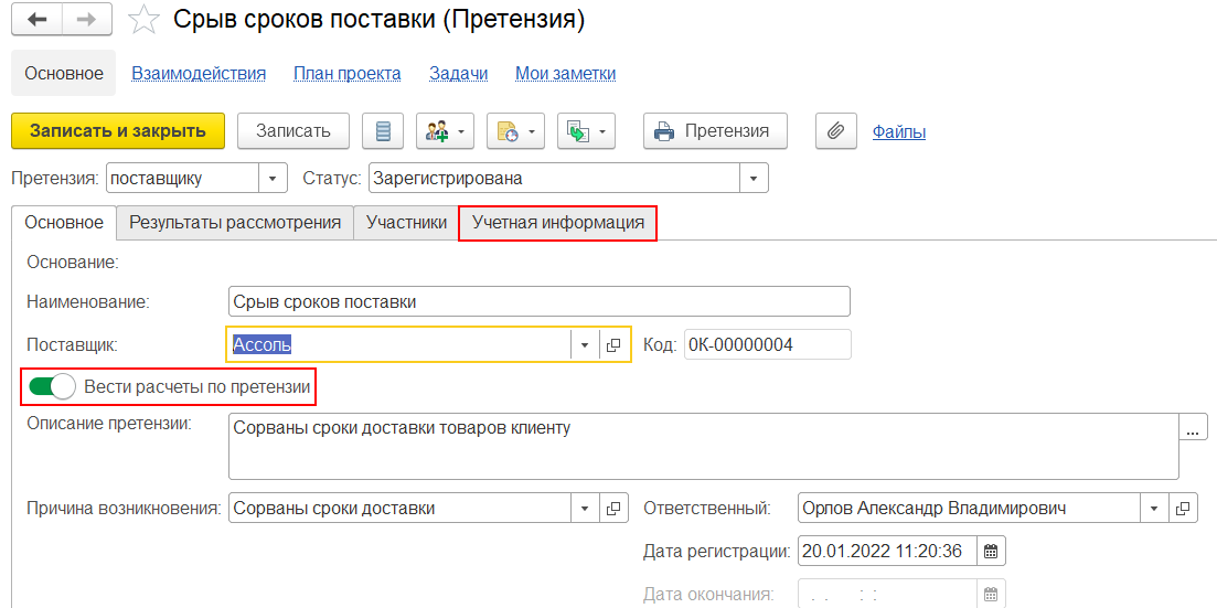 После заполнения учетной информации претензия становится объектом расчетов и доступна для выбора в документах в качестве объекта расчетов.
