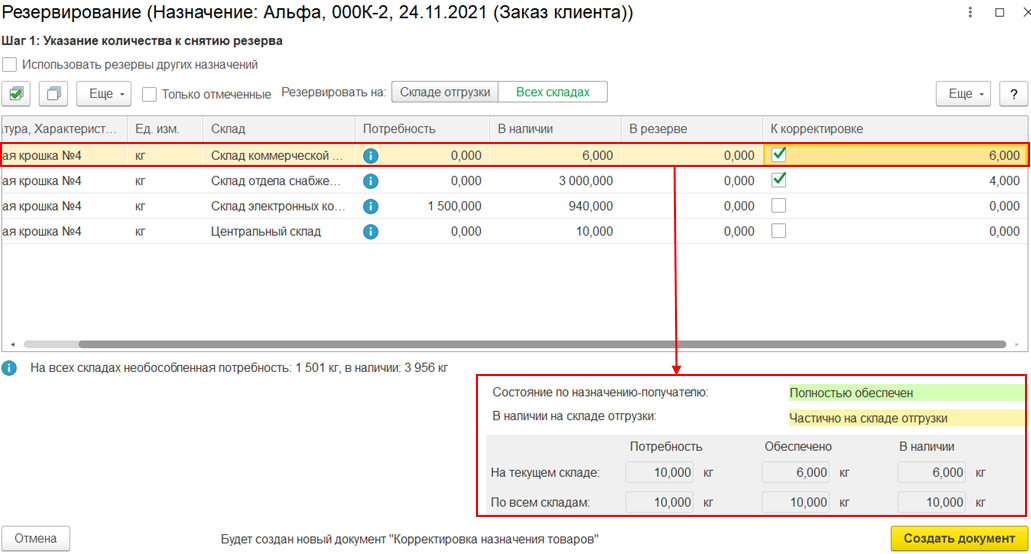 При резервировании в заголовке обработки по заполнению корректировки назначения отображается назначение-получатель, под которое необходимо обособить товары на складе.