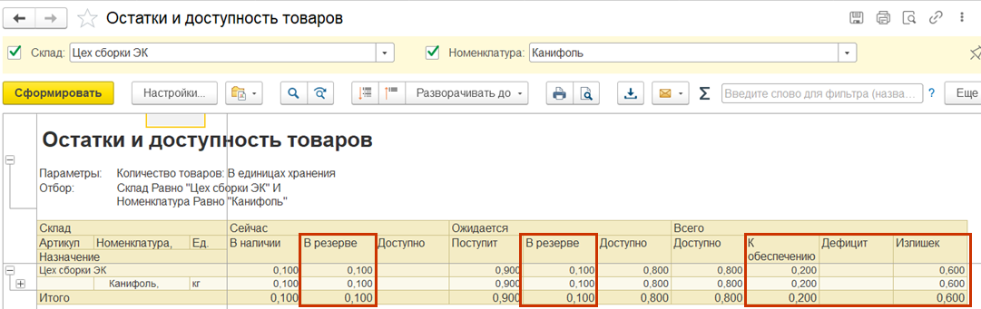 В отчет добавлены новые колонки «К обеспечению», «Дефицит», «Излишек».