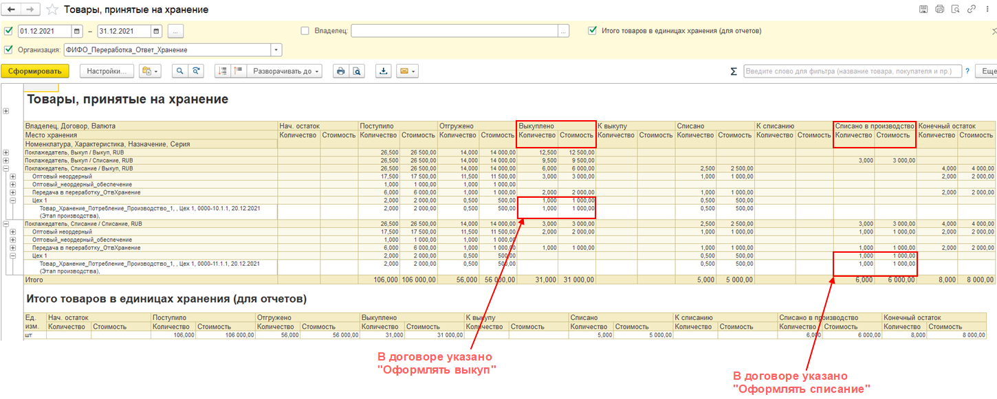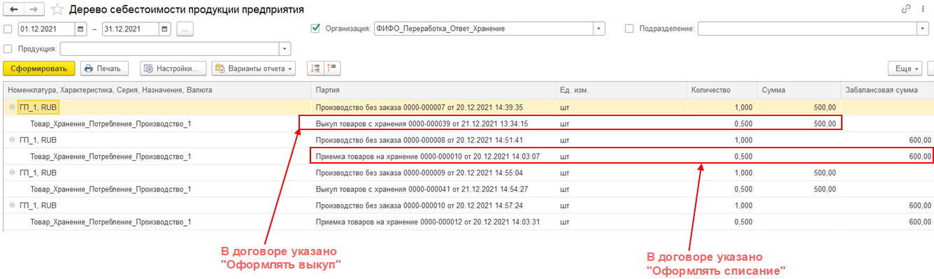 Если в договоре установлена настройка Оформлять списание, то на партии производства списывается товар, принятый на ответственное хранение: