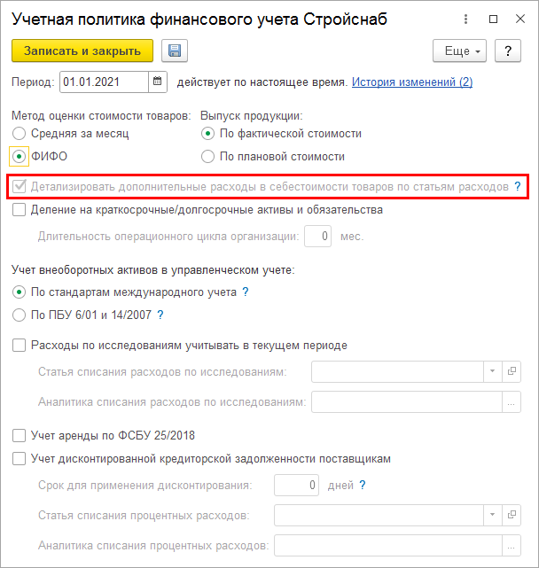 Детализация себестоимости товаров до статей дополнительных расходов доступна только при использовании метода оценки стоимости ФИФО.