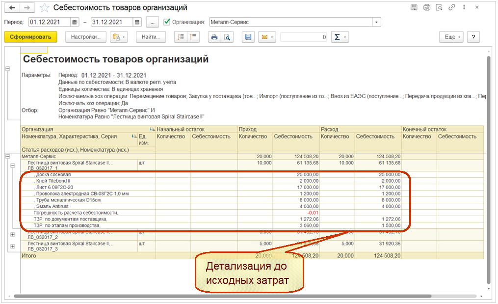Детализация до исходных затрат в отчетах будет видна только в периодах, рассчитанных с новым механизмам детализации себестоимости. В отчетах поддержан выбор полей для расшифровки детализации себестоимости до исходных затрат.