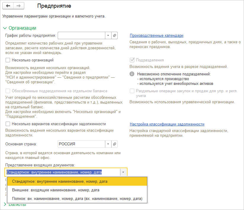 Для управления отображениям документов используется настройка НСИ и администрирование – Предприятие – Представление входящих документов:
