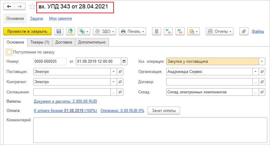 Дата поступления в накладной не всегда может совпадать с датой поступления по заказу. По этой дате можно отслеживать ожидаемое поступление товаров с использованием отчета «Остатки и доступность товаров».