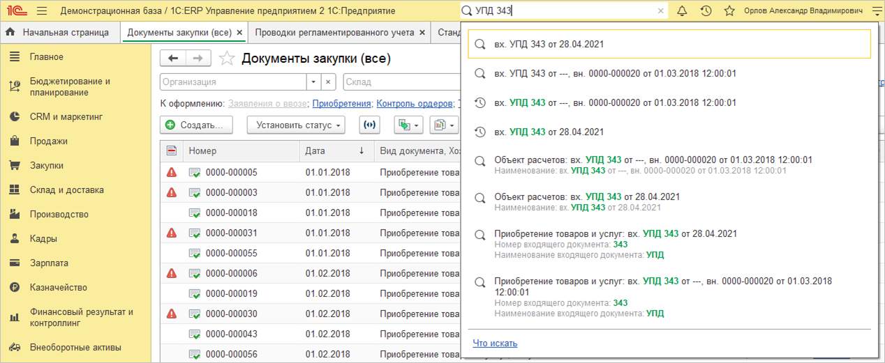 При глобальном поиске используются данные о документах из общего журнала документов, который хранится в регистре сведений Реестр документов, с учетом настроек представления входящих документов.