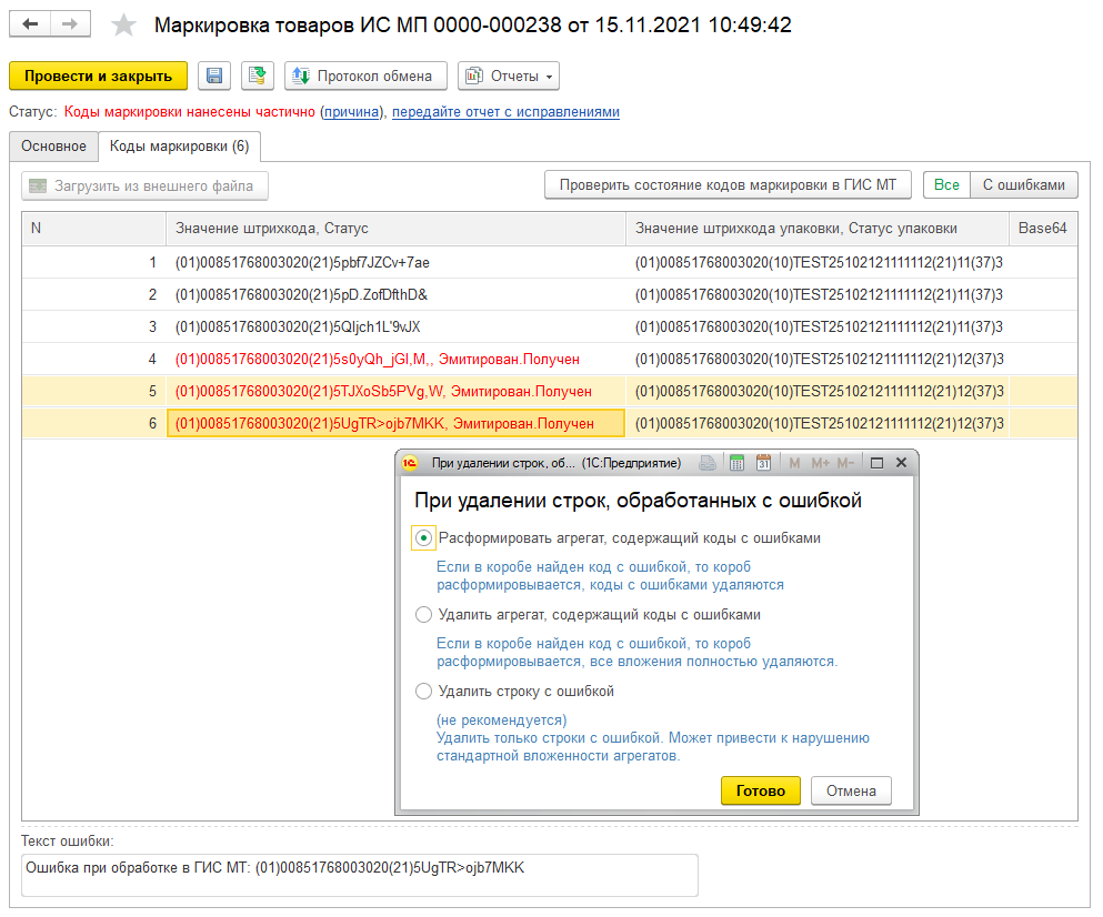 Если документ передается в режиме Отчет производственной линии работа с проблемными кодами выполняется на закладке Коды маркировки. По кнопке Проверить состояние кодов маркировки в ГИС МТ можно выполнить запрос статуса кодов, обработанных с ошибками. При удалении строк ошибок с кодами, входящими в упаковку, будет открыто окно для выбора режима удаления других строк, входящих в ту же упаковку: