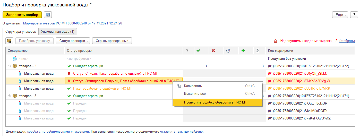 Если режим Отчет производственной линии не используется, то коды редактируются в форме Подбор и проверка маркируемой продукции. На форме выделены коды, требующие повторной отправки, или имеющие недопустимый статус. В форме доступны следующие действия: