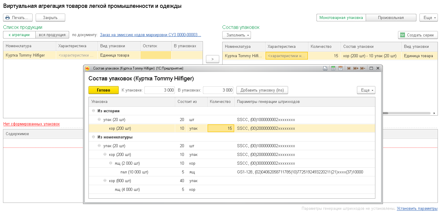 При формировании набора и дальнейшей агрегации наборов в логистические упаковки произвольной структуры можно использовать механизм виртуальной агрегации.