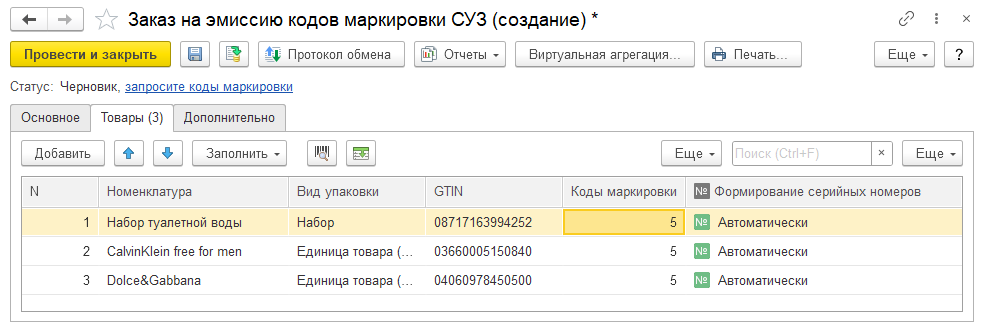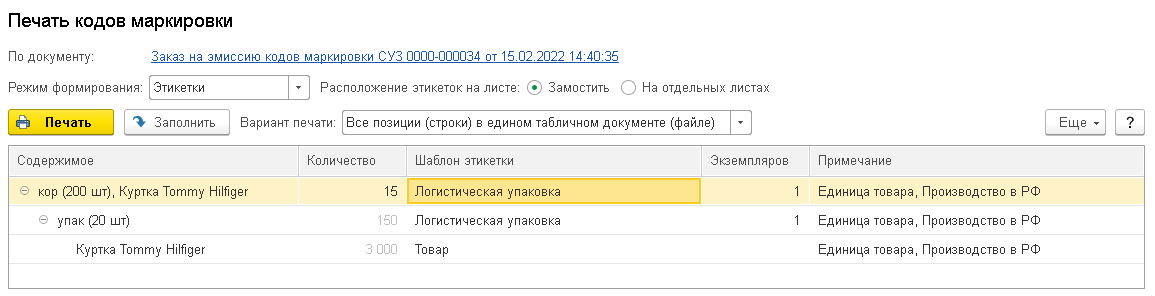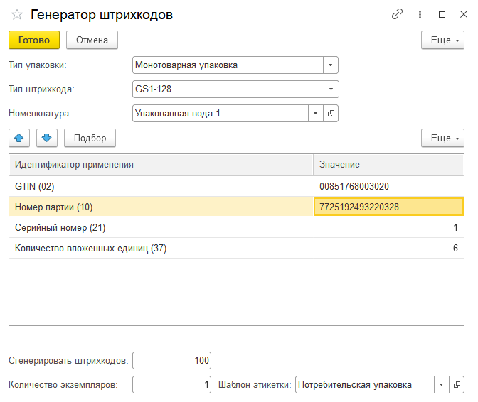 Если в предыдущих заказах на эмиссию были заказаны потребительские упаковки совместно с групповыми, тогда при сканировании штрихкода, при подборе номенклатуры, при вводе заказа на эмиссию на основании, система самостоятельно рассчитает и добавит, необходимое для заказа, количество кодов маркировки групповых и потребительских упаковок.