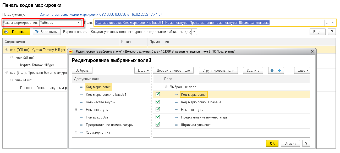 В случае выбора режима таблица можно настроить состав полей. Рекомендуется включить в состав полей код маркировки в формате base 64.