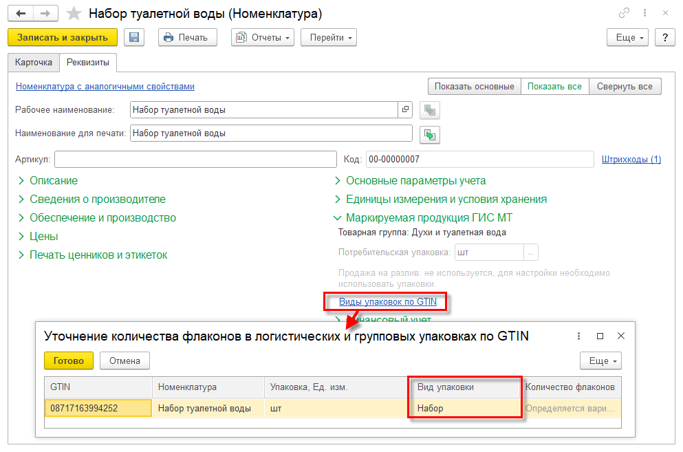 В карточке номенклатуры по ссылке Маркируемая продукция ГИС МТ – Виды упаковок по GTIN можно уточнить, какому виду упаковки соответствует код GTIN: потребительской упаковке, групповой упаковке (если для вида продукции предусмотрены групповые упаковки), логистической упаковке или набору.