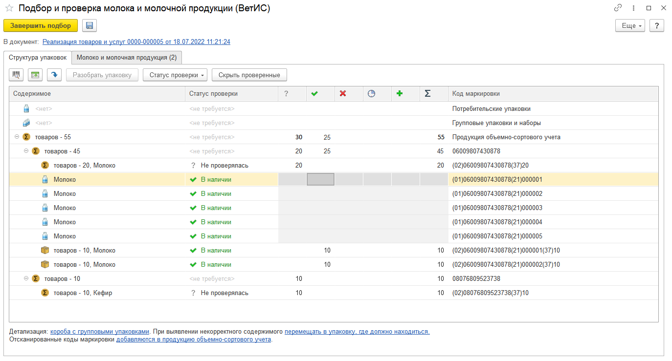 Для групповых упаковок со стандартной вложенностью автоматически рассчитывается количество групповых упаковок, которые можно собрать. Строки с потребительскими упаковками не отображаются, т.к. они считаются вложенными в групповую упаковку.