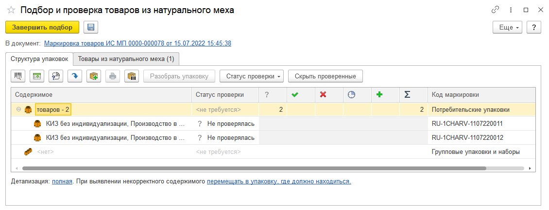 Для меховых товаров не предусмотрена операция агрегации. При выполнении операций указываются непосредственно КиЗ каждого товара. В форме подбора и проверки маркируемой продукции рекомендуется использовать детализацию в параметрах сканирования до потребительских упаковок.