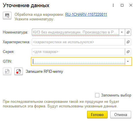 В форме подбора и проверки маркируемой продукции при считывании КИЗ, требующего индивидуализацию будет открыта форма Уточнение данных. В этой форме требуется выбрать номенклатуру и GTIN, которые будет записаны в RFID-метку. GTIN (EAN) может быть считан сканером штрихкода. В этом случае будет запрошено считывание данных метки оборудованием RFID. После выбора GTIN требуется записать его в RFID-метку.