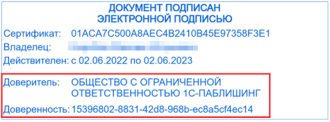 Если электронная подпись выполнена по доверенности, то при формировании штампа этой ЭП будет отображаться доверитель и номер доверенности.
