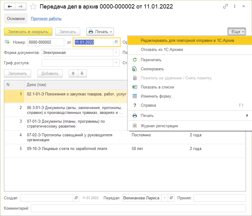 Для корректировки данных или отмены отправки в карточке описи Передача дел в архив в меню Еще предусмотрены команды: