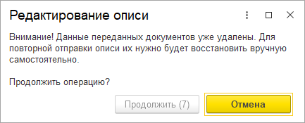 Возможность отзыва описей доступна только при использовании 1С:Архива версии 1.0.9 и выше.