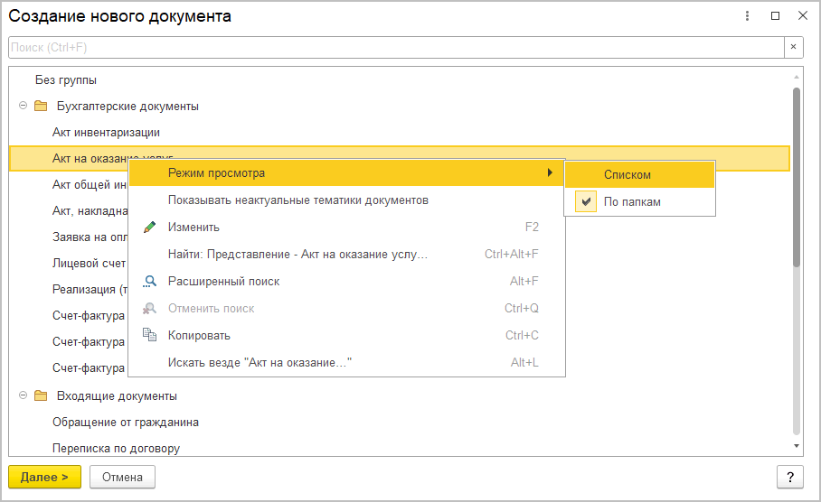 Теперь в программе при создании документа при выборе шаблона можно установить группировку по папкам видов документов либо Вид документа + Тематика (если ведется учет по тематикам). Благодаря этому больше не придется пролистывать весь список шаблонов, чтобы найти нужный.