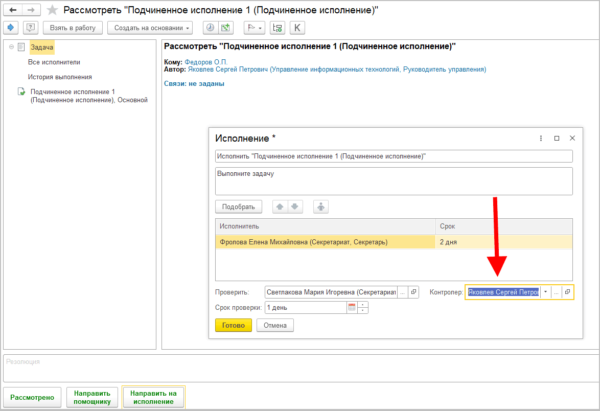Для этого достаточно указать контролера в карточке подчиненного исполнения.