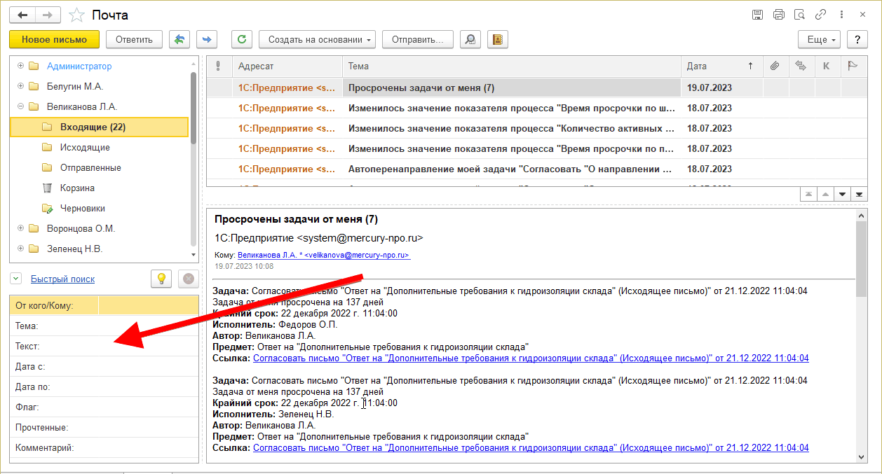 В новой версии программы доступен поиск писем встроенной почты по тексту. Программа ищет запрошенный текст в теле письма.