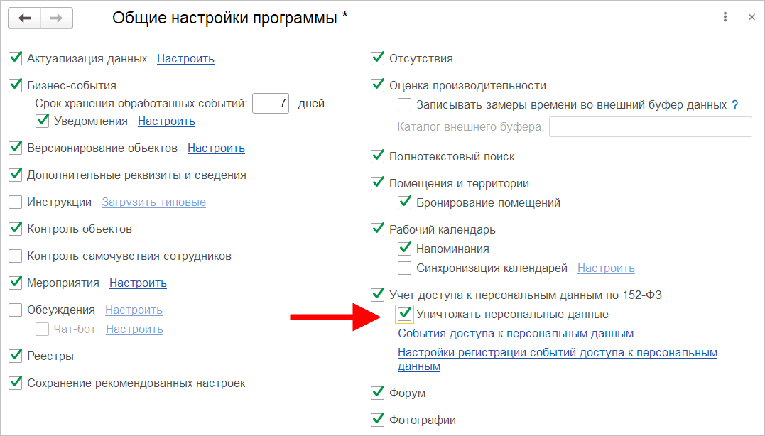 Для использования возможности в настройках программы необходимо включить настройку Уничтожать персональные данные. По умолчанию настройка отключена.