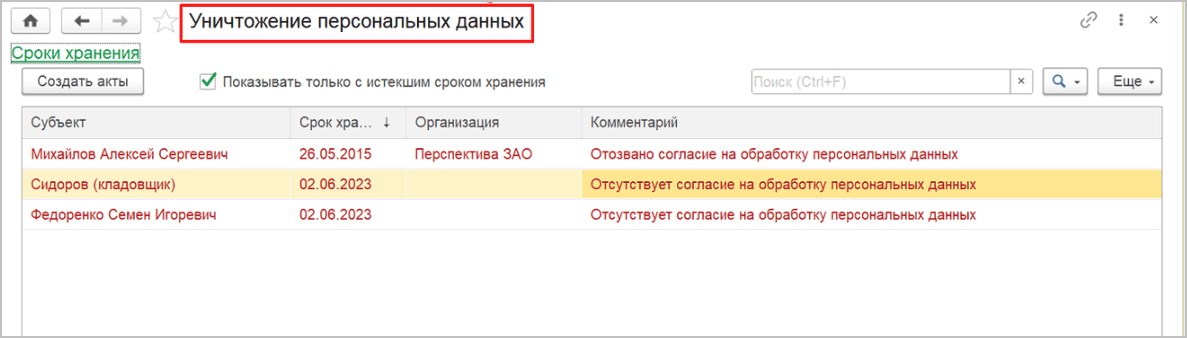 С помощью настройки Показывать только с истекшим сроком хранения отобразятся те персональные данные, у которых срок хранения истек.