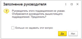 Теперь если в карточке подразделения не заполнен руководитель, то синим шрифтом отображается вышестоящий руководитель и программа задает вопрос перед тем, как продолжить.
