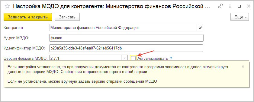 Раньше программа при получении от контрагента документов по МЭДО запоминала версию формата МЭДО, в котором он их прислал, и в дальнейшем автоматически актуализировала эту версию, если она менялась. Исходящие сообщения отправляются строго в этой версии.