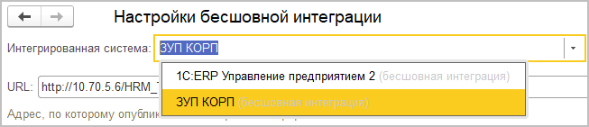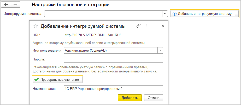 2. Выбрать из списка Интегрируемую систему. При первой настройке – список пуст. В этом случае необходимо нажать кнопку Добавить интегрируемую систему и в открывшемся окне ввести адрес публикации, имя пользователя и пароль. После этого нажать Добавить, и программа автоматически подключится к веб-сервису интегрируемой системы.