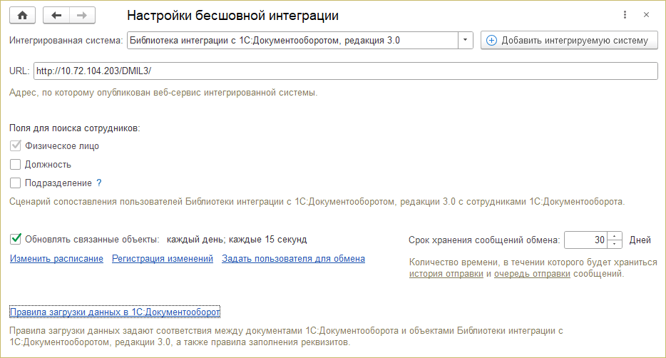 Обратите внимание на настройку Поля для поиска сотрудников. В ней необходимо указать, по каким критериям будут сопоставляться пользователи конкретной интегрируемой системы с сотрудниками 1С:Документооборота: