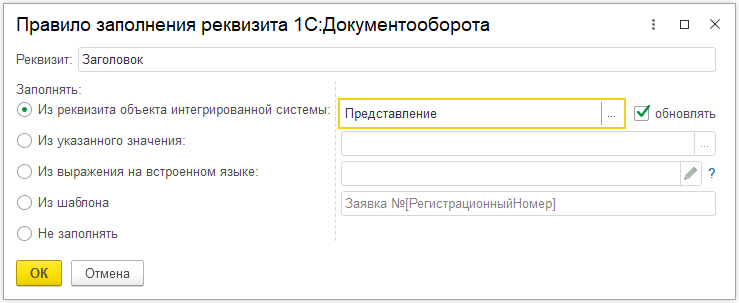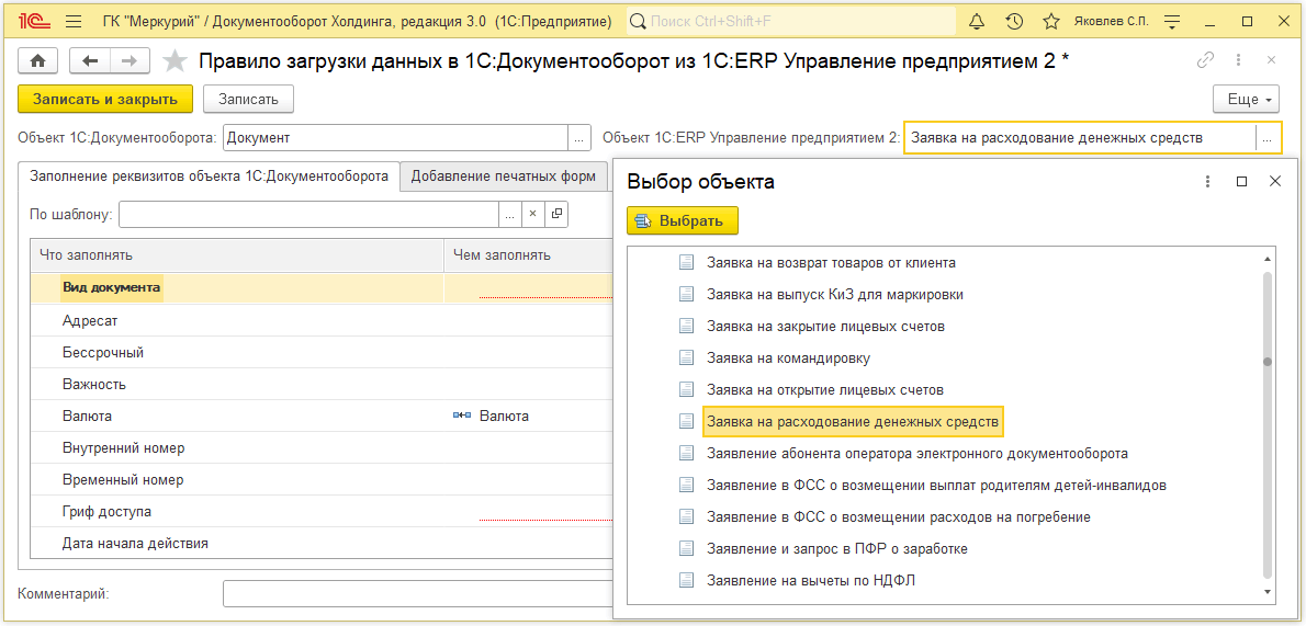 В правилах можно настроить заполнение любого реквизита объекта 1С:Документооборота. Также можно настроить заполнение дополнительных, общих и нетиповых реквизитов, добавленных самостоятельно на внедрении. Список реквизитов формируется в зависимости от вида документа. Например, для «Заявки на оплату» недоступен реквизит «Контрагент», но доступен «Получатель».