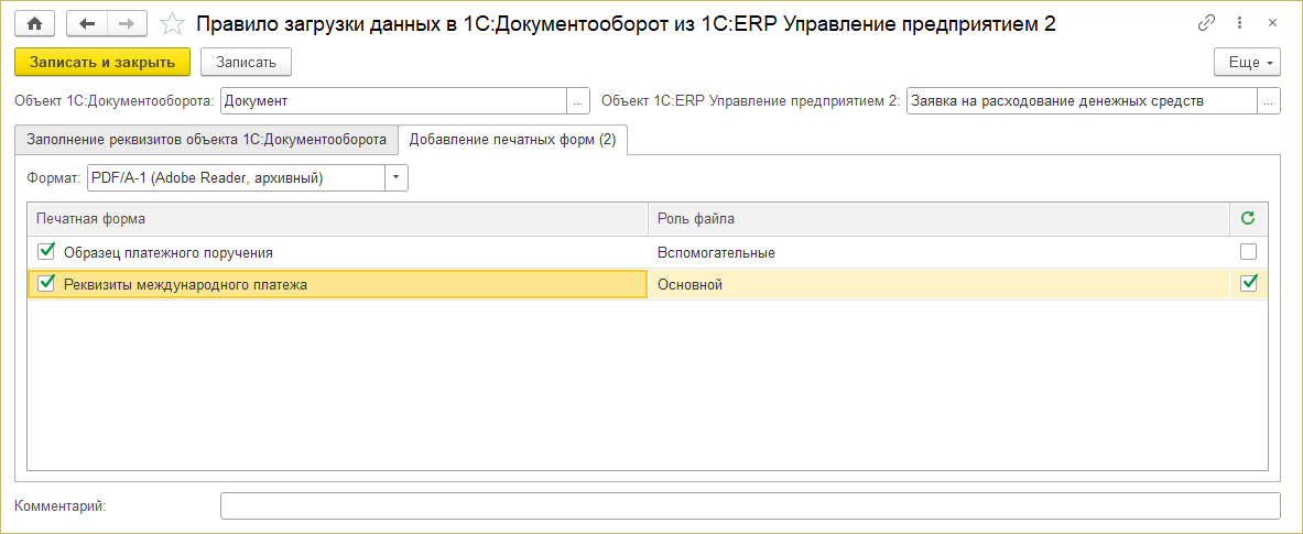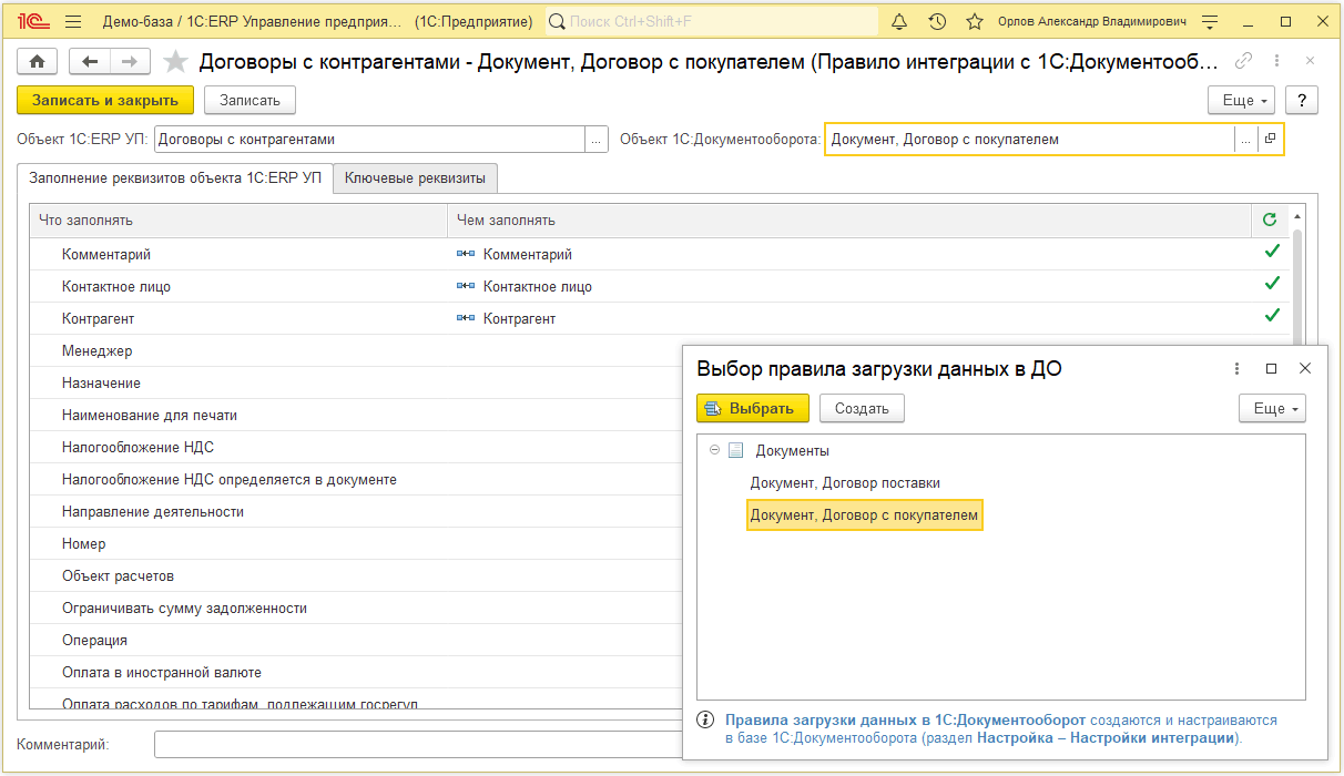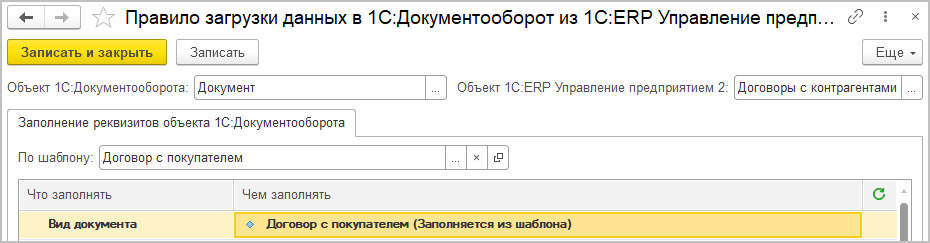 4. Настроить правила загрузки данных. Для этого необходимо перейти по ссылке Правила загрузки данных в 1С:Документооборот и создать новый элемент. В открывшейся карточке выбрать:
