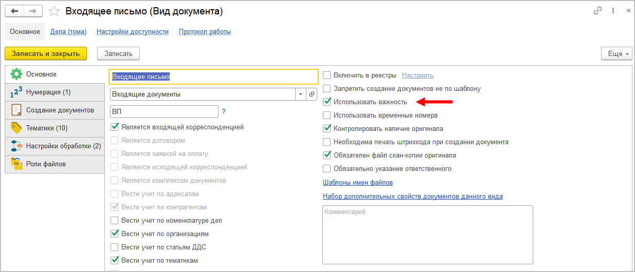 Возможность включается в карточке вида документа настройкой Использовать важность.