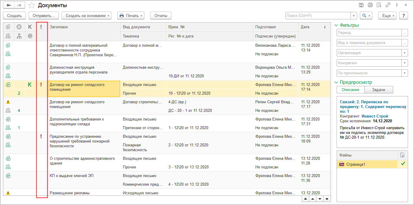 Это удобно для расстановки приоритетов в работе над документами. Например, чтобы при нехватке ресурсов сотрудники в первую очередь брали в работу только приоритетные задачи.