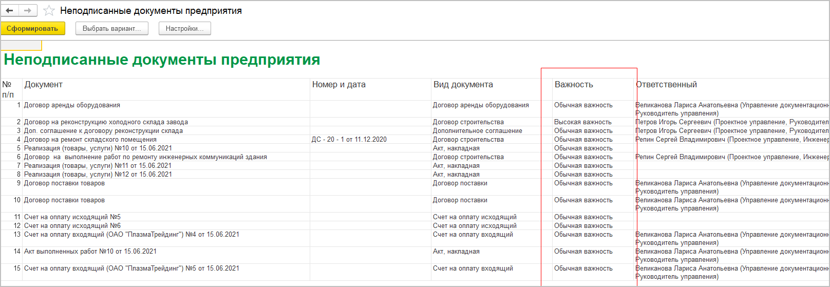 Важность отображается в отчетах «Документооборот по организациям», «Договоры», «Документы предприятия», «Неподписанные документы предприятия». По умолчанию она скрыта.
