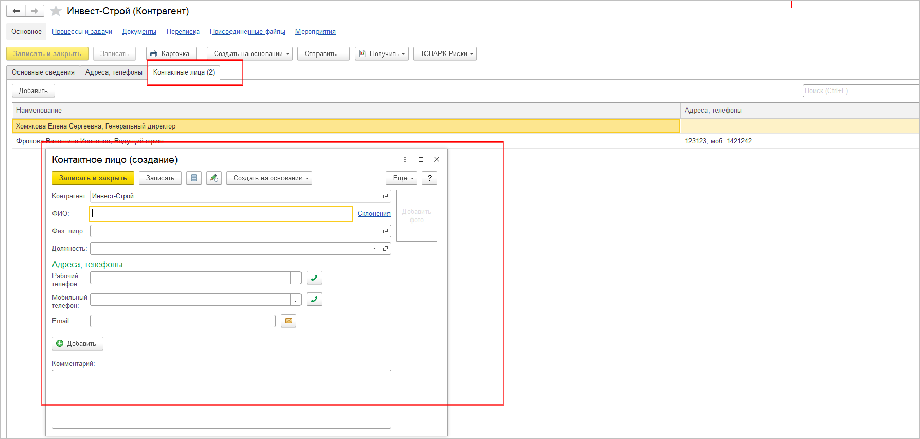 Теперь сотрудникам без права создания контрагентов можно разрешить добавлять в их карточки данные контактных лиц.