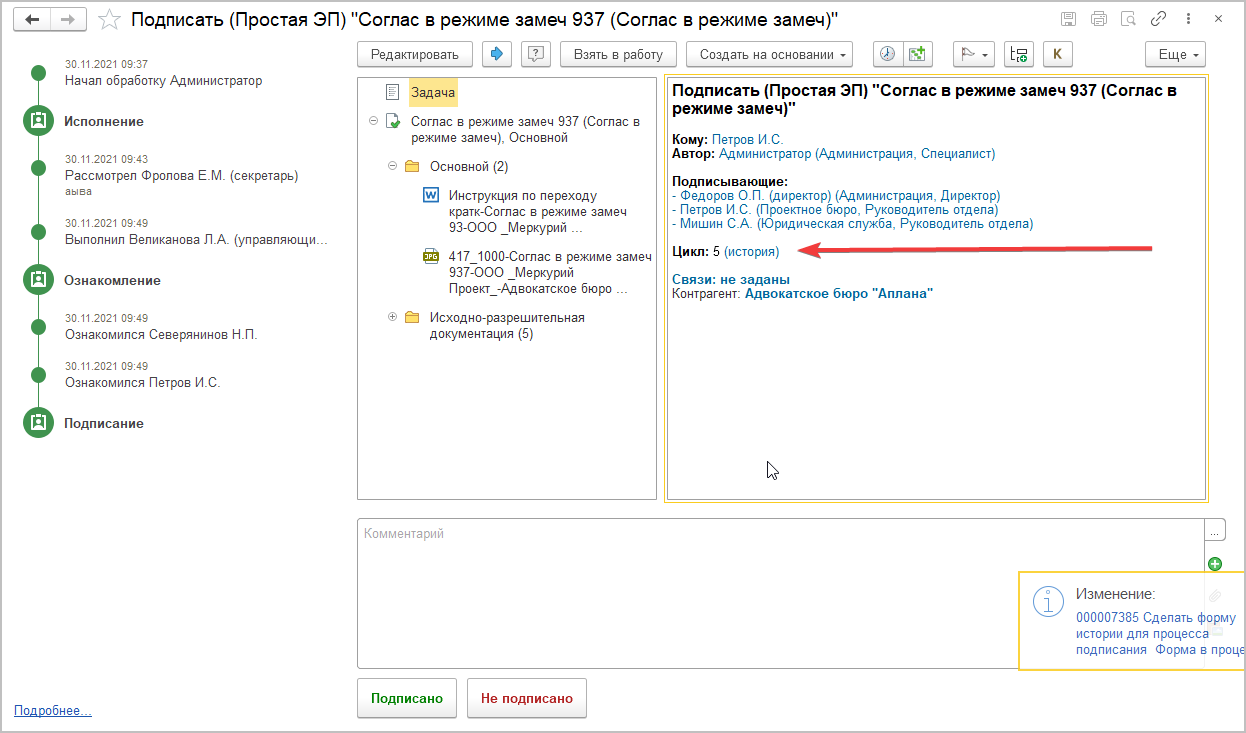 В новой версии программы можно посмотреть историю подписания объекта. Для этого в карточке Подписания теперь отображается История.