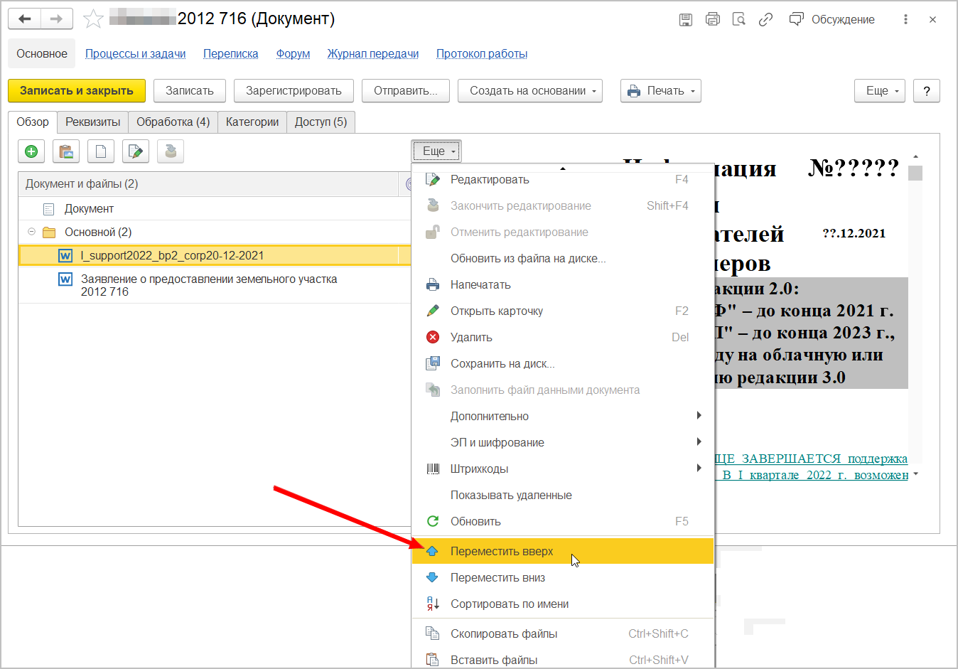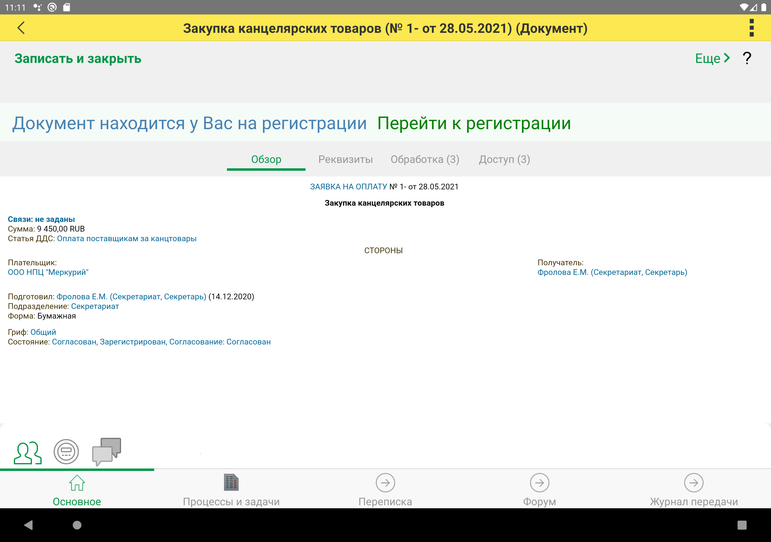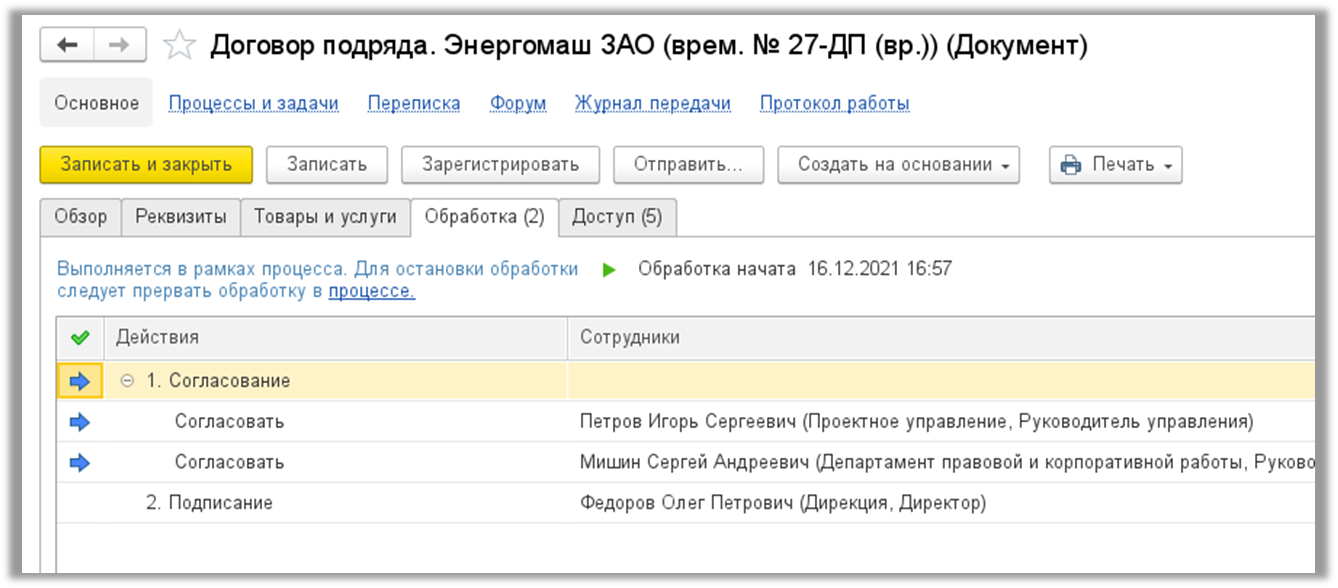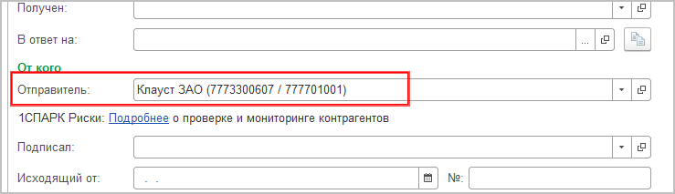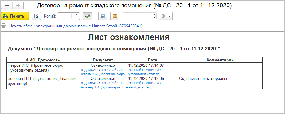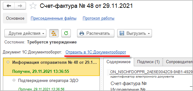 После записи документа будет установлена связь документа ЭДО и документа «1С:Документооборота», после этого будет доступно выполнение команд по ЭДО из карточки документа «1С:Документооборота».