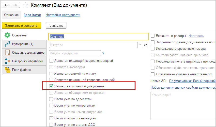 В карточке вида документа вновь отображается настройка Является комплектом.