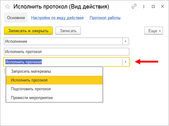 Этапы действий обработки мероприятий можно выбрать в карточке вида действия.