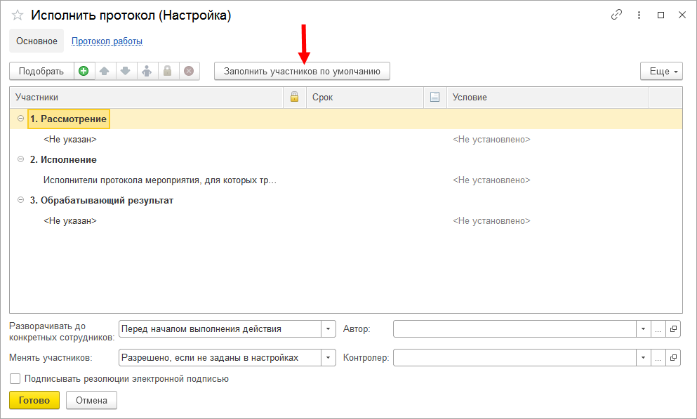 В карточке правила обработки мероприятия предусмотрена кнопка Заполнить участников по умолчанию.