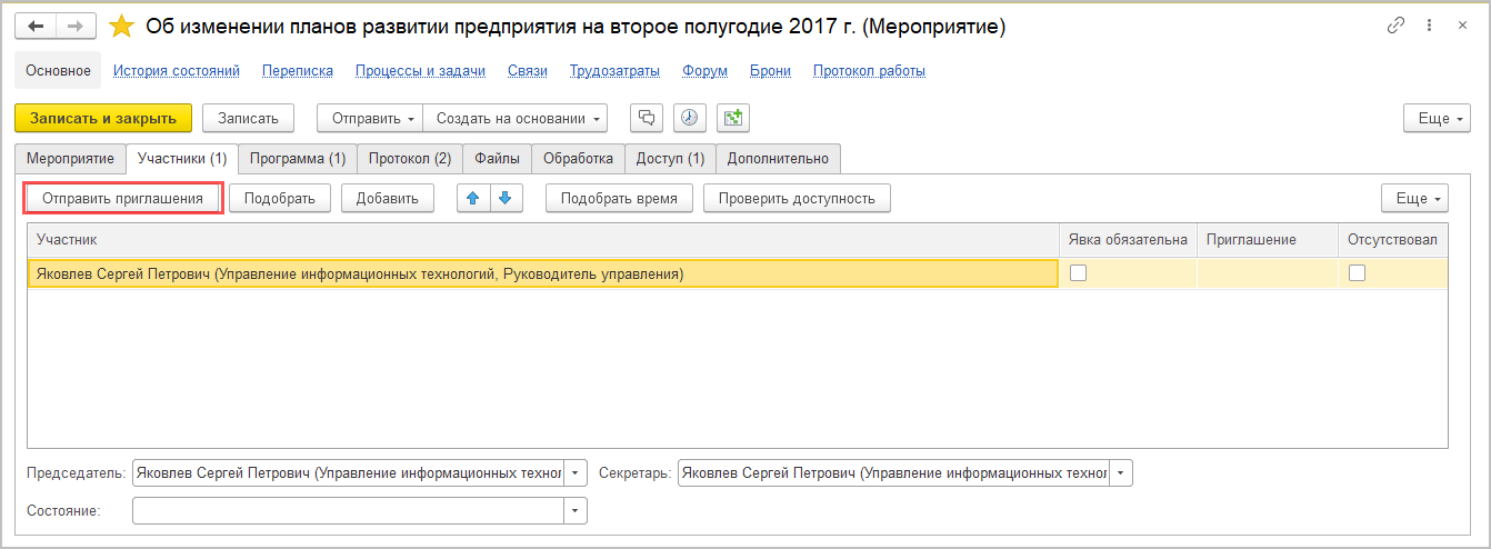 Для отправки приглашений в карточке мероприятия предусмотрена команда Отправить приглашения в подменю Отправить и на закладке Участники.